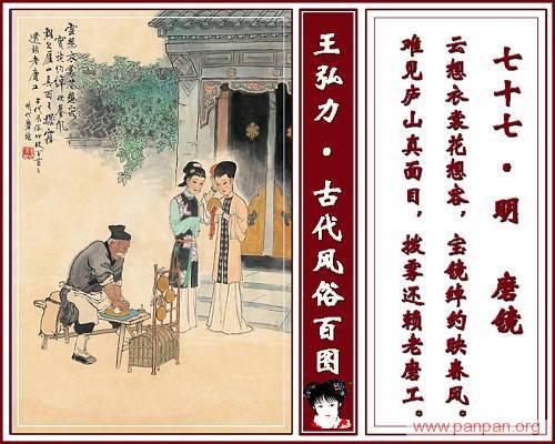 古代用铜镜照面,用久则不明,需倩工磨之。如遇喜事,为使镜面光洁,也要磨之,